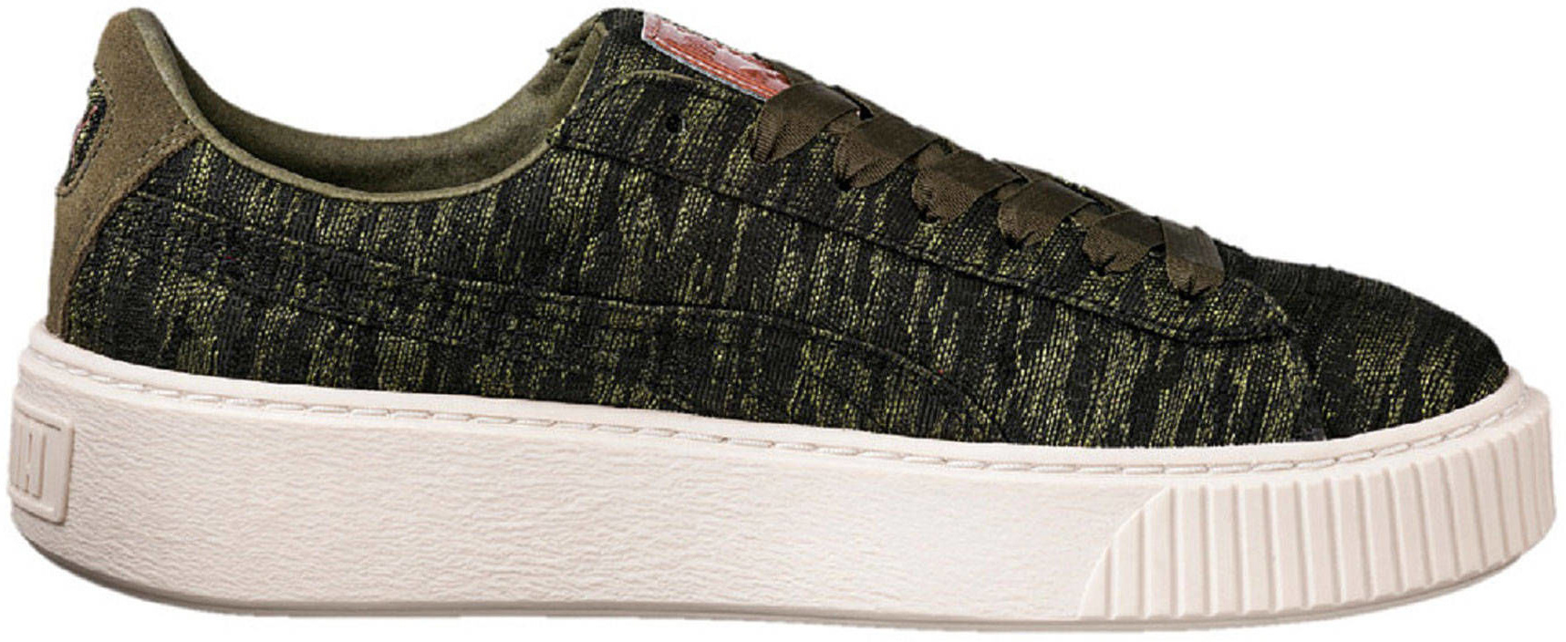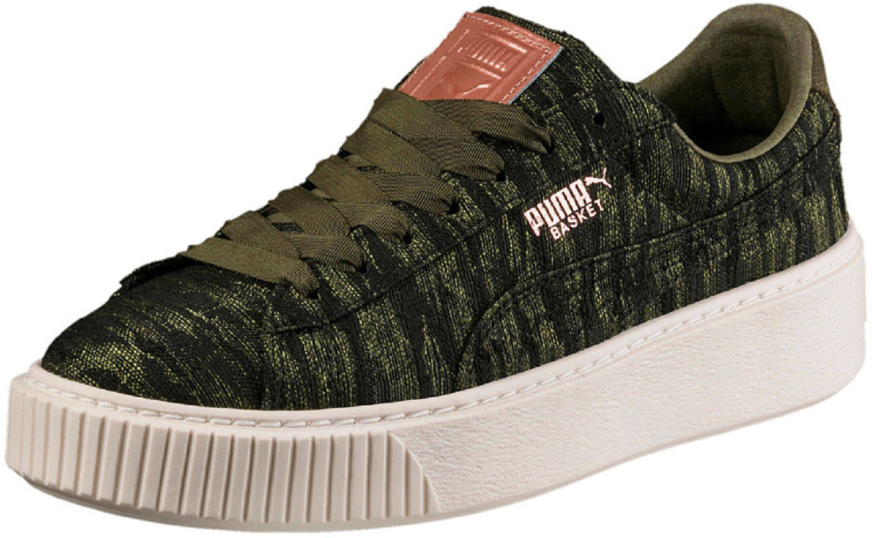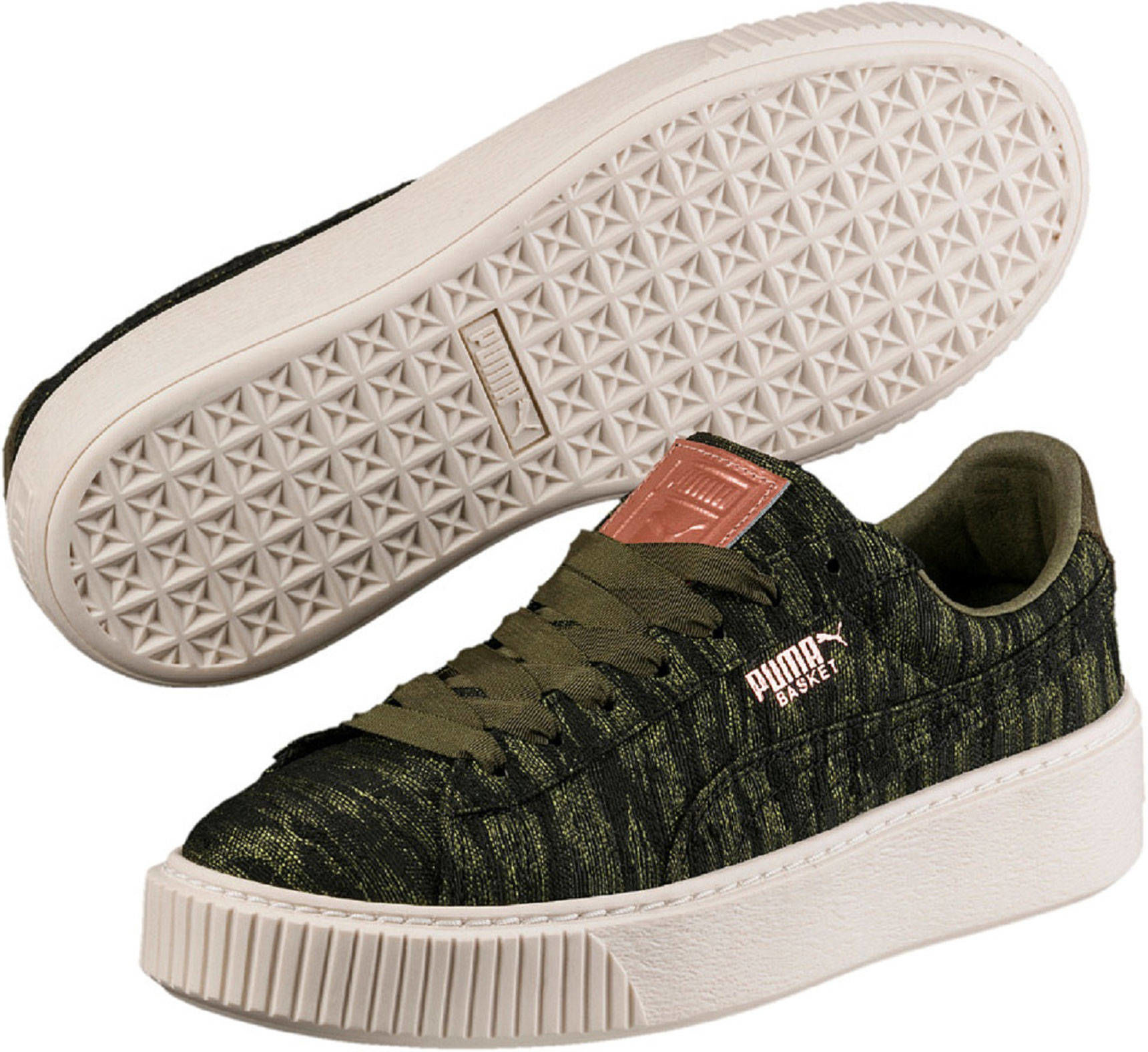 Der Basket Platform Velvet Rope von Puma bringt seine Trägerin stylisch und modern in die Grunge-Hochzeit der 90er Jahre zurück. Die breite Plateausohle und das samtige Obermaterial im Camouflage-Stil machen diese Schuhe zum absoluten Highlight.- reguläre Passform- Low-Top-Einstieg- Schnürung- gewebtes Obermaterial in samtigem Look- modisches Camouflage-Muster- extradicke Gummilaufsohle verleiht den stylischen Platform-Look- Logoaufnäher auf der Zung und Schriftzug seitlich in schimmerndem Rosé-Metallic